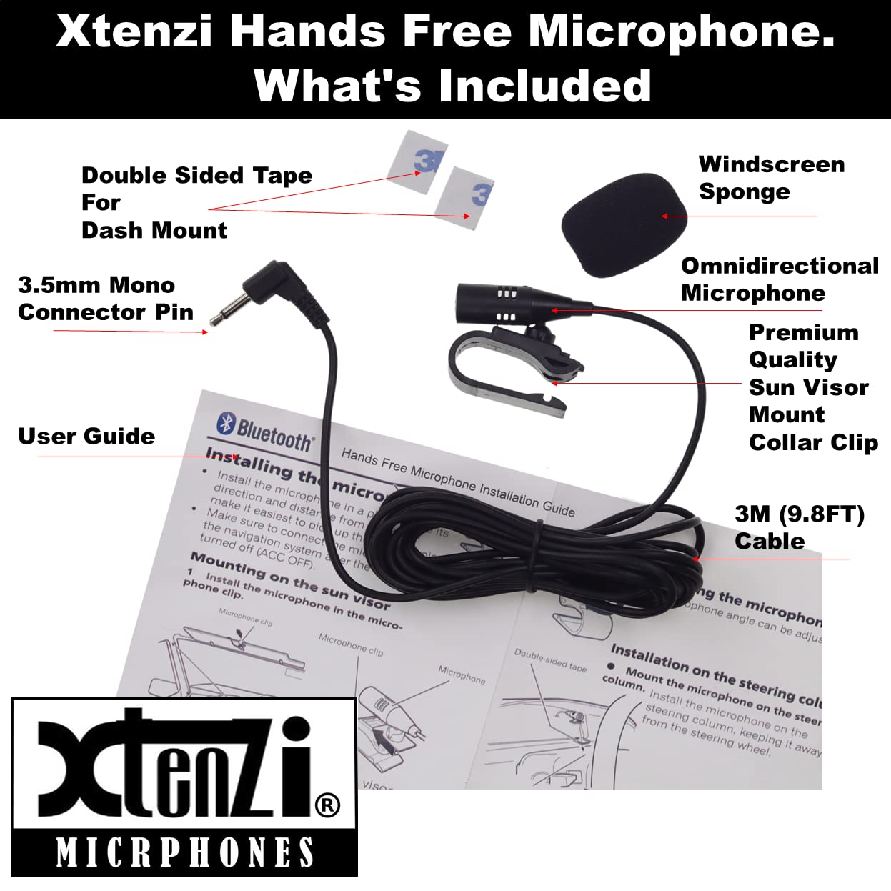 The microphone comes supplied with a mounting clip which allows you to clip the microphone to your visor or mount it to a clean, flat surface using the supplied two-sided tape. Once mounted the, the mounting clip allows you to adjust the angle of the microphone up or down for better coverage in your vehicle.