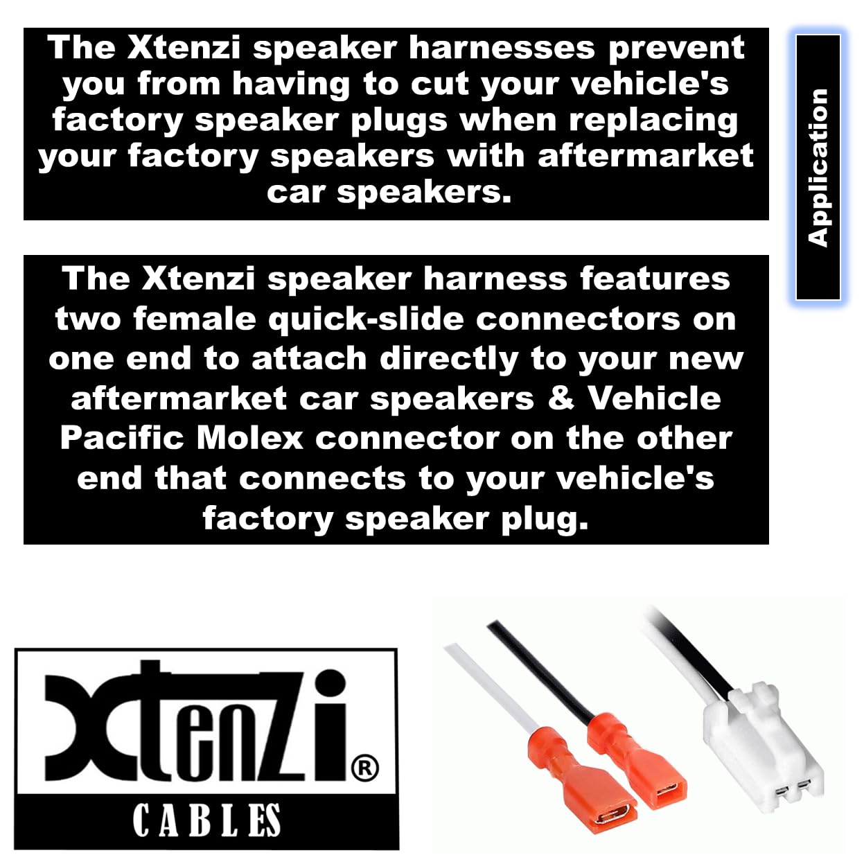 The precision hand assembled terminals are pressure-inserted into the plug making it virtually impossible to pull a wire out. The speaker harness features two female quick-slide connectors on one end to attach directly to your new aftermarket car speakers and a proprietary Molex connector on the other end that connects to your vehicle's factory speaker plug.